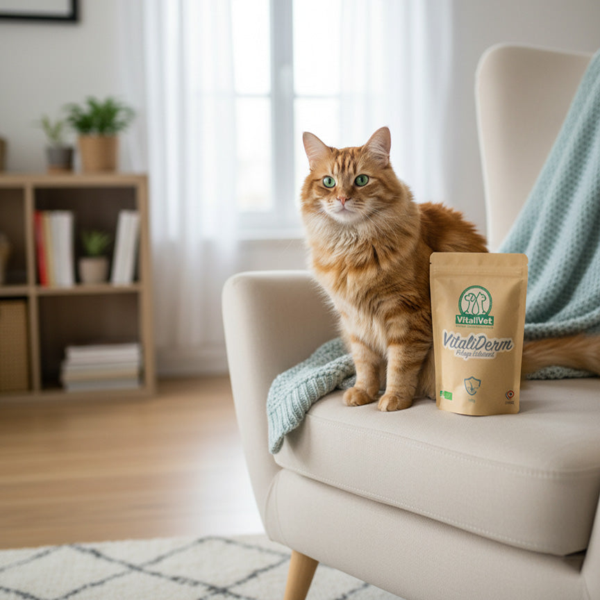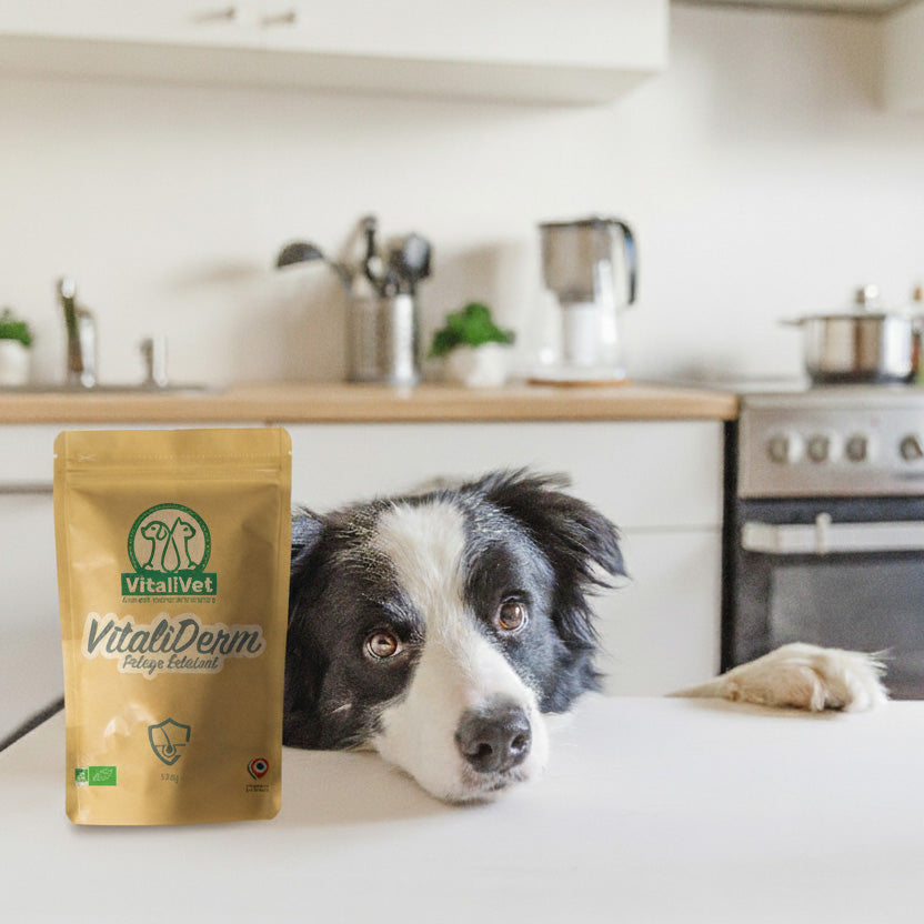VitaliDerm est une formule haut de gamme pour le soin du pelage et de la peau de votre chien et de votre chat. Enrichi d'ingrédients biologiques de la plus haute qualité, notre complément alimentaire est spécialement conçu pour nourrir en profondeur les poils et la peau, leur procurant brillance et santé.